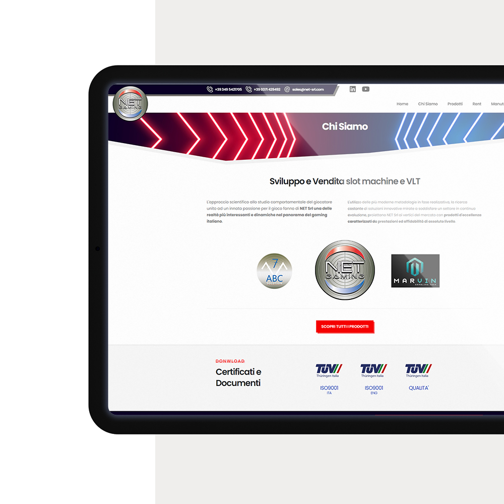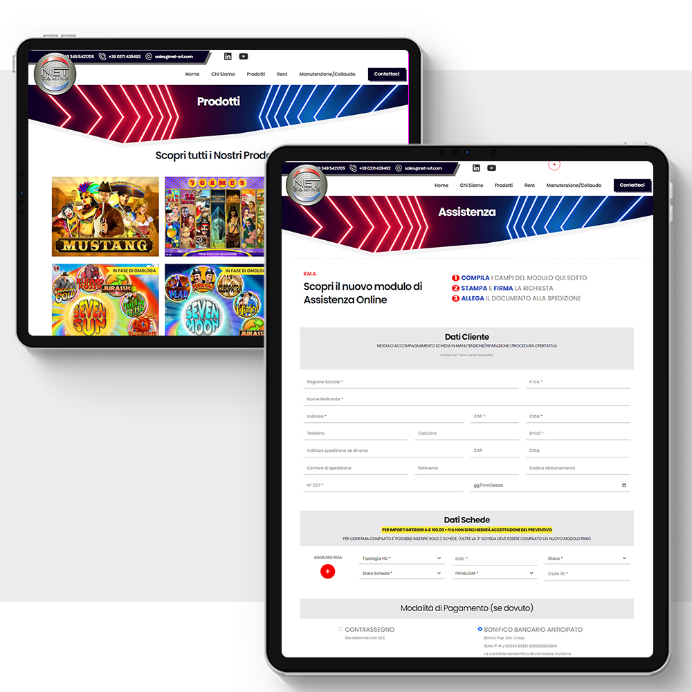 Gestione dei contenuti personalizzata per gestire la home e l'inserimento di nuovi giochi con le relative schede gioco. Possibilità di compilare direttamente online le schede RMA e i verbali, e stamparle già compilate.